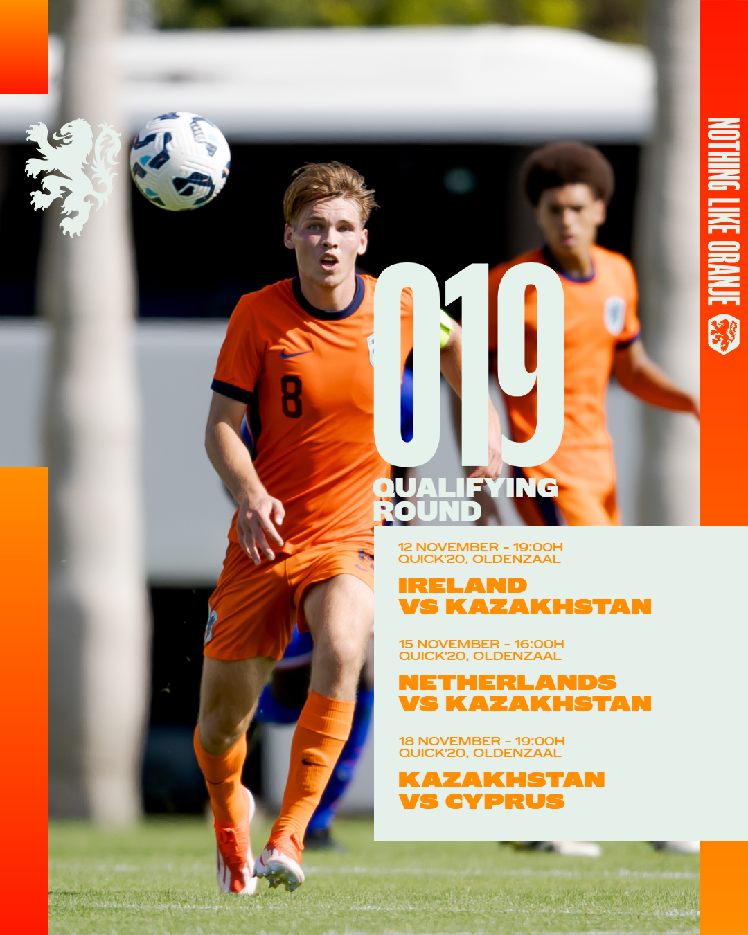 Het verjongde Oranje onder 19, dat in juni van dit jaar nog werd gekroond tot Europees kampioen, mag onder leiding van de nieuwe coach Adil Ramzi op zaterdag 15 november in Oldenzaal de strijd aangaan tegen het onbekende Kazachstan. Ramzi kwam vroeger onder andere uit voor FC Twente en PSV.